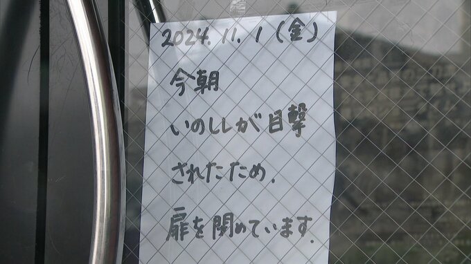 イノシシの出没を受け、近くのビルの入り口には「イノシシが目撃されたため扉を閉めています」と書かれた張り紙が…