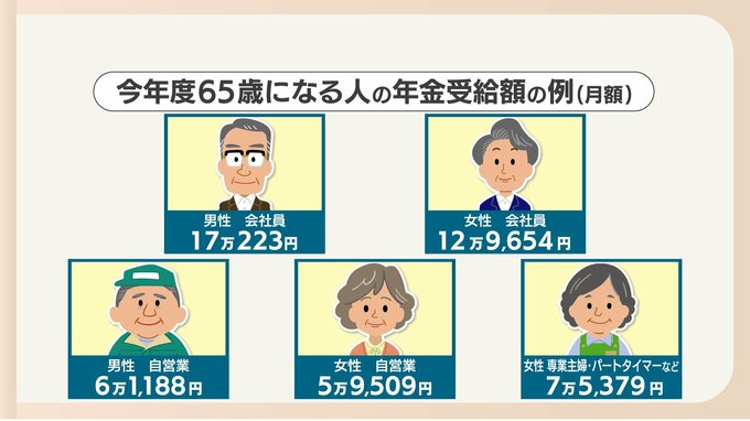国民年金中心の自営業の男性で月額6万1188円、自営業の女性は月額5万9509円。