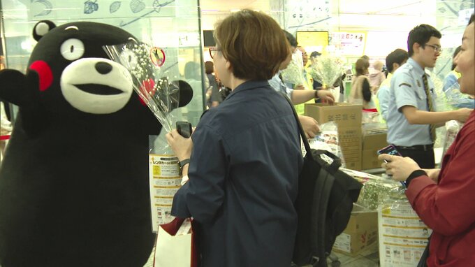 15日、JR博多駅でくまモンや駅長らが配ったのは、熊本県が出荷量日本一を誇るカスミソウです。