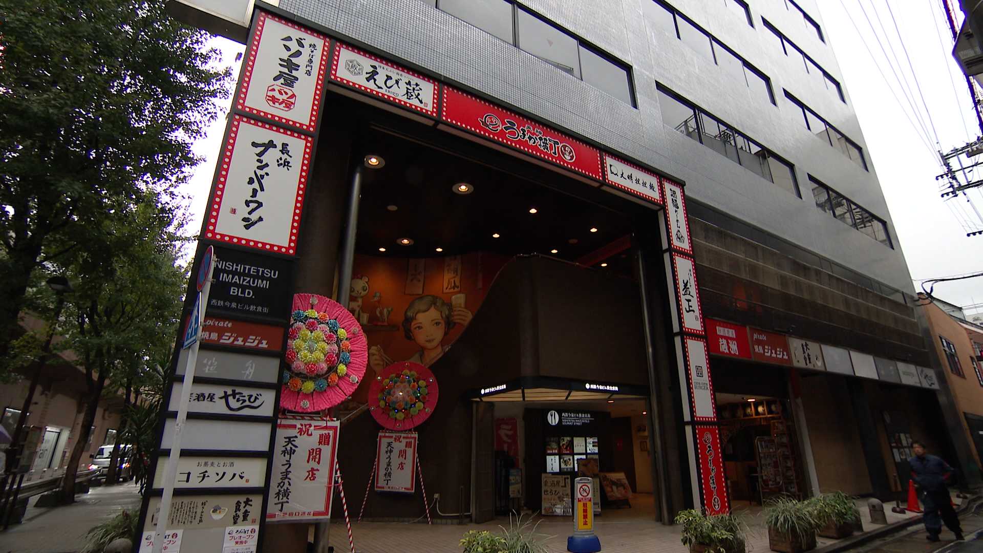 瓶ビールを飲む女性がビルの壁に大きく描かれているのは、西鉄福岡(天神)駅の近くに28日オープンする飲食ゾーン、「うまか横丁」です。