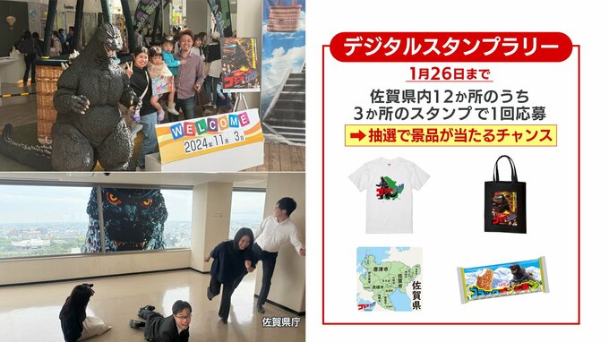 そして、吉野ヶ里遺跡や唐津城など、佐賀県内12か所の観光スポットのうち3か所をめぐって応募すれば、抽選でゴジラのバッグやTシャツなどの景品が当たるキャンペーンも開催中です。(2025年1月26日まで)