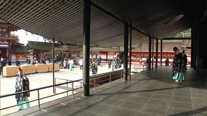 太宰府天満宮ではきょう午前9時から、7人の神職が長さ約4メートルの笹竹を使って、仮殿の屋根裏にたまった煤や塵などを丁寧に払い落しました。
