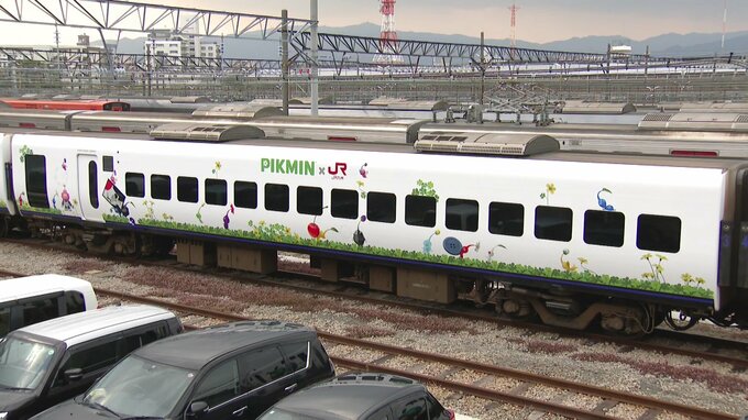 福岡市博多区のJR南福岡車両区でお披露目されたのは、任天堂のゲームキャラクターピクミンがラッピングされた「ピクミントレイン」です。
