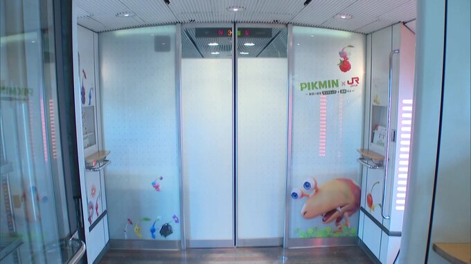 車体には並んで歩く色とりどりのピクミンがデザインされているほか、車内にも、敵から逃げたり休んだりしているピクミンが描かれています。