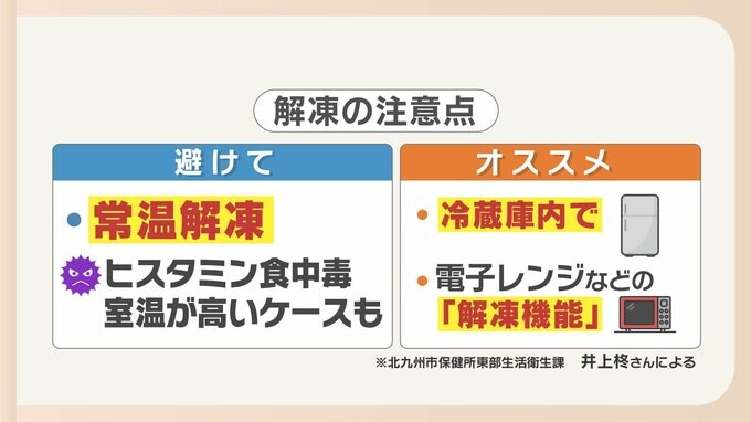 北九州市保健所・東部衛生生活課 井上柊さん「常温解凍すると、常温におかれて温度が高い状態になりますので、細菌がより増えやすくなりますので、増えたことによってヒスタミンが生成されたり、細菌自体が食中毒になったりしますので、冷蔵庫で解凍するのがよいかと思います」