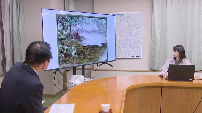 井上澄和市長に受賞を報告した花田さんは、受賞したきのこ狩りサバイバルゲーム「きのこを狩るもの」を披露しました。