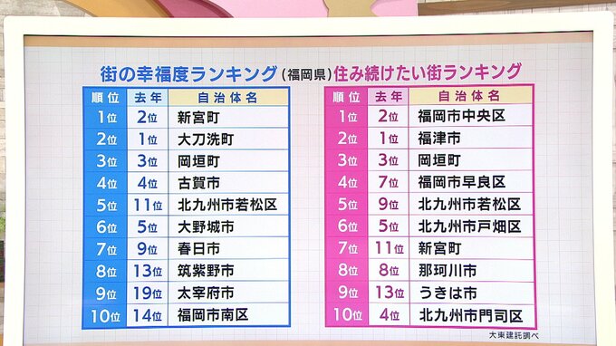 住み続けたい街ランキングでは福岡市中央区が前年の2位から順位を上げて1位となりました。