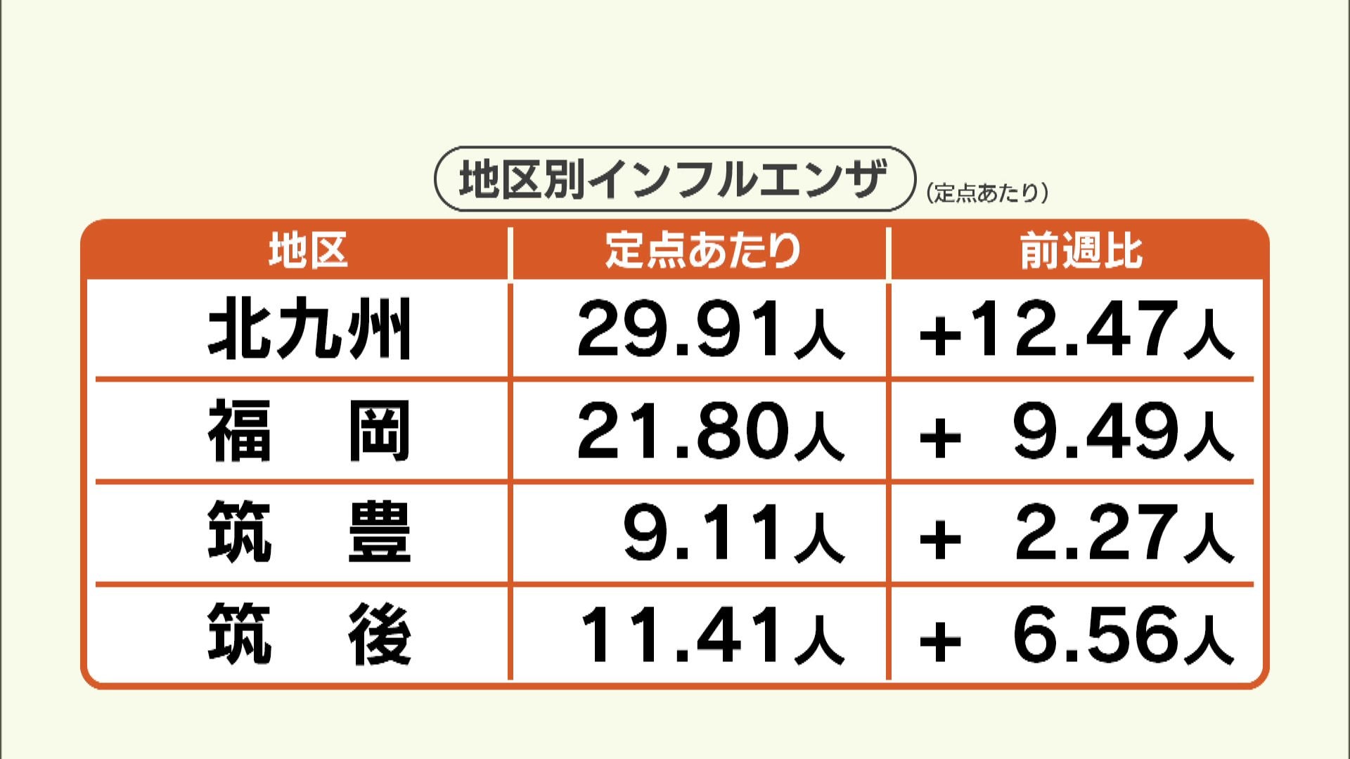地区別では、北九州地区29.91人、福岡地区21.80人、筑豊地区9.11人、筑後地区11.41人、となっていていずれも前の週より増えています。