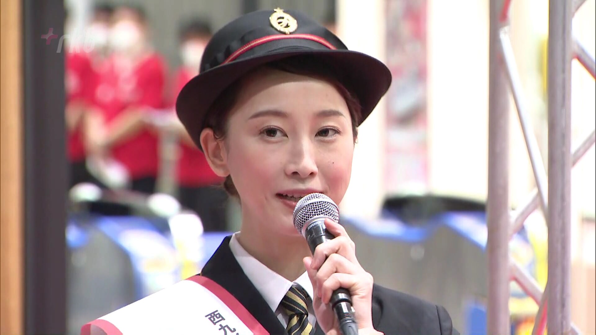 体操では着地と同時に両手を挙げますが23日は右手を挙げ新幹線を送り出しました。そして嬉野温泉駅では、女優で大の鉄道ファン・松井玲奈さんが一日駅長を務めました。