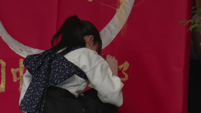 16日午前、福岡市の福岡中央郵便局では、天神ちとせ保育園の園児たちの合唱にあわせて、福岡中央高校の書道部の生徒が来年の干支である「巳年」の文字を書くパフォーマンスを披露しました。