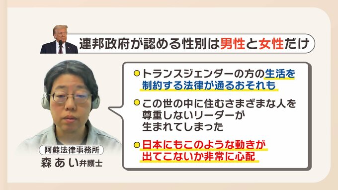 阿蘇法律事務所 森あい弁護士「国のトップがこういうメッセージを出してしまうということで、差別をしていいとか攻撃をしていいとかいうメッセージを与えてしまっているんじゃないかとすごく心配です。アメリカと日本はかなり近い国だと思うんです。アメリカの政治もですし、企業も最近、多様な人々を包括するような企業としての施策から後退するようなことが出てきてますけど、そういった動きが日本にも出てこないか心配です」