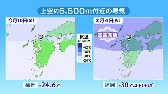4日、九州北部の上空5500m付近の気温は、マイナス30℃以下が予想されています。