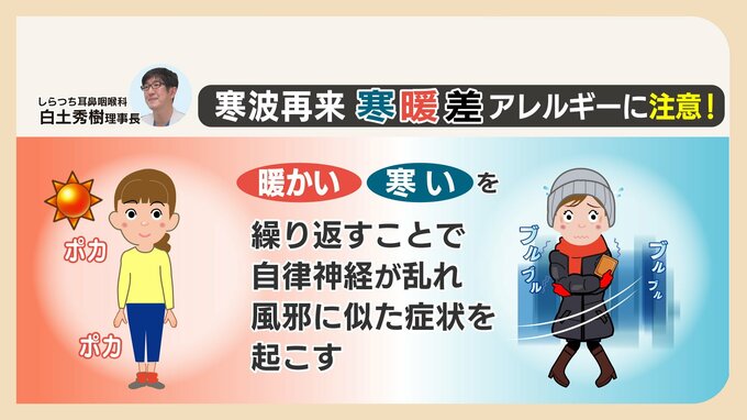 福岡市南区の「しらつち耳鼻咽喉科」の白土医師によると寒暖差アレルギーとは、あたたかい、寒いを繰り返すことで自律神経が乱れ風邪に似た症状が起きるさらに今、花粉も飛んでいます。症状での見分け方です。