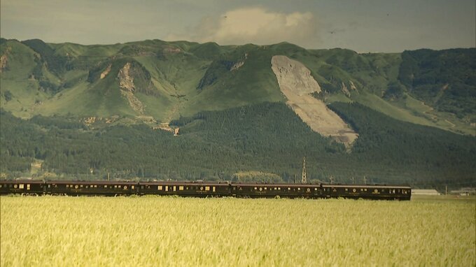 会場では、山陽線の列車と関門海峡の夜空を彩る花火を一枚に収めたものや、熊本県阿蘇市の雄大な自然の中を駆け抜けるクルーズトレイン、「ななつ星」などを見ることができます。