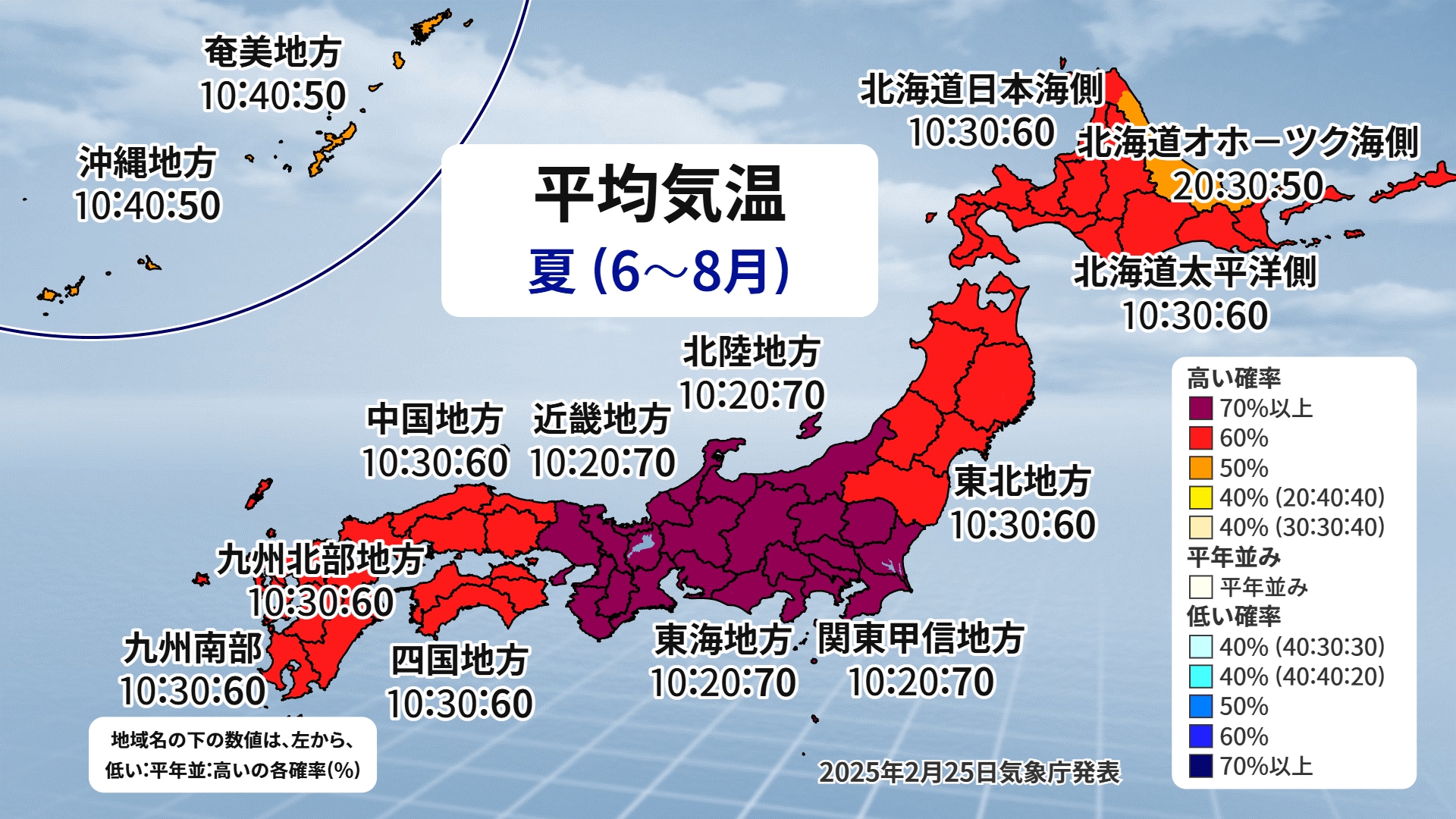 そして、気になる夏の予報。6月~8月の予報(暖候期予報)を見ると、全国的に気温が高くなる確率が50~70%。