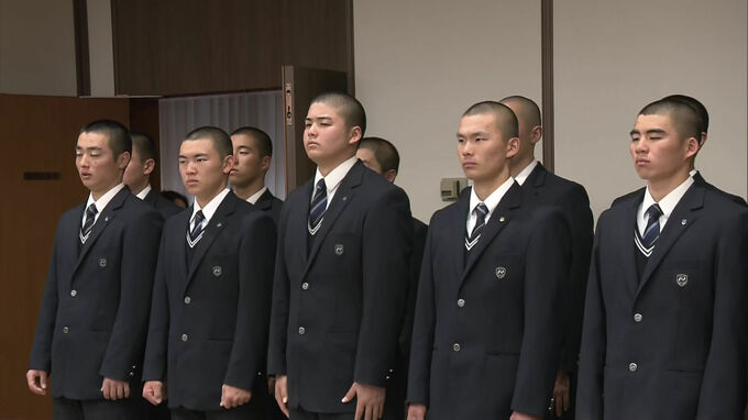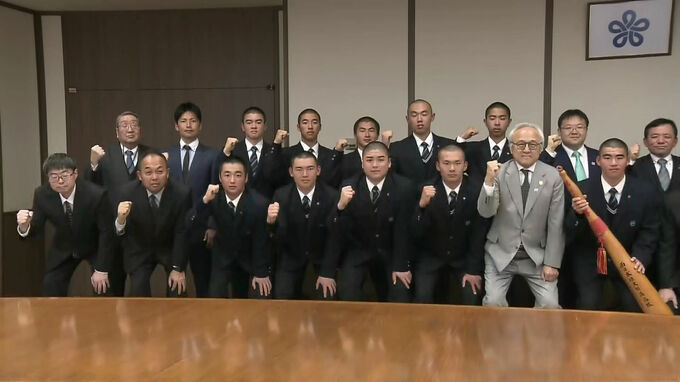 目指すは全国制覇です。来月開幕の春の甲子園に出場する西日本短大付属高校の野球部が、28日福岡県庁を訪れ意気込みを語りました。