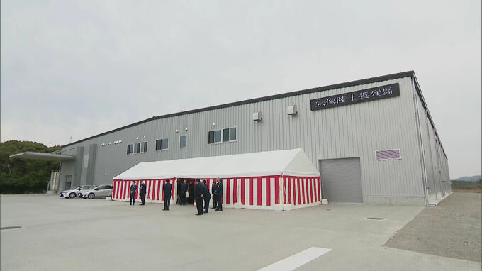 「道の駅むなかた」の側に完成したサーモンの陸上養殖場では10日、竣工式が行われ、関係者およそ50人が出席しました。