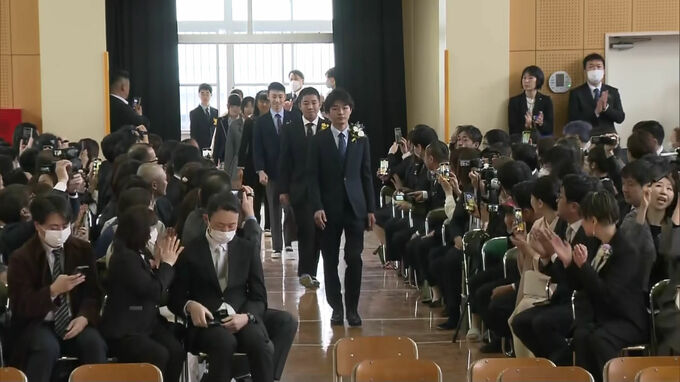 このうち、福岡市西区の今宿小学校では、約150人の卒業生が保護者の拍手に迎えられ、体育館に入場しました。