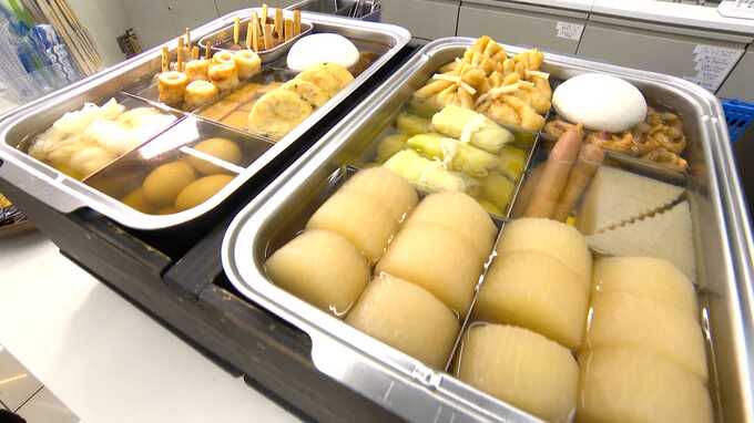 博多駅の近くにあるコンビニのローソンです。レジカウンターには今年も熱々のおでんが並んでいて寒い日を中心に売上を伸ばしています。具材は全部で17種類。人気ランキングでみると、全国共通で不動のベスト3となっています。