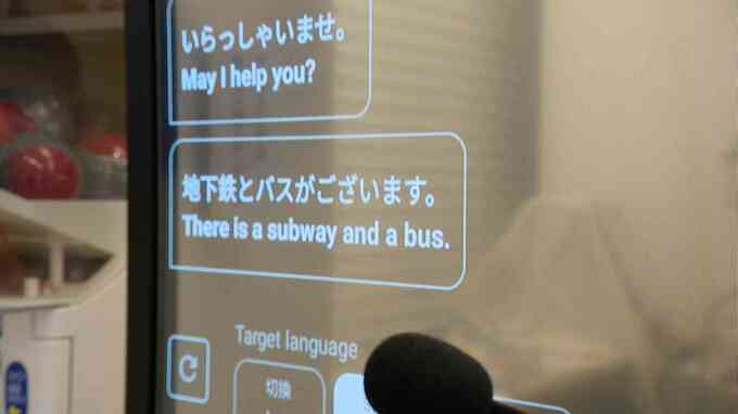 日本語で答えると、今度は翻訳された英語が利用者側のディスプレイに表示される仕組みです。異なる言語でも自然に会話ができるこのシステム。台湾のスタートアップ企業が開発したもので、福岡の通信事業者「QTnet」と共同で14日から実証実験を行います。