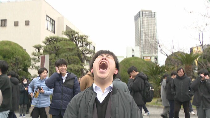 自分の番号を見つけた受験生たちは、ガッツポーズをしたり家族や友人と抱き合ったりして、喜びを噛みしめていました。