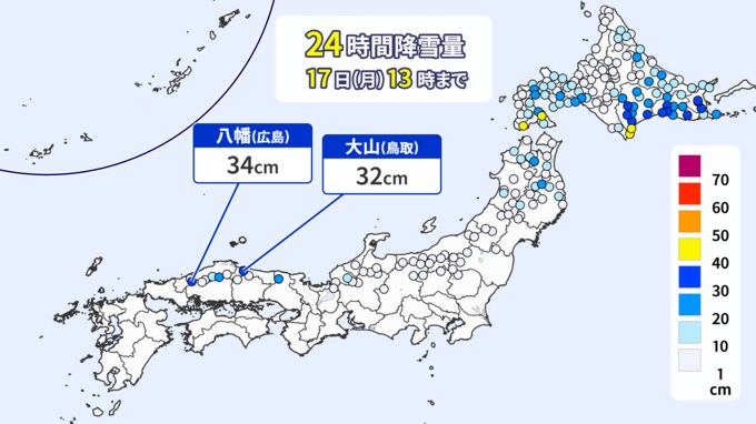 17日午後1時までの24時間降雪量は、広島県の八幡34センチ、鳥取県大山32センチなど、西日本では季節外れの大雪となっている所があります。