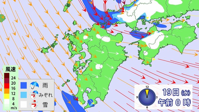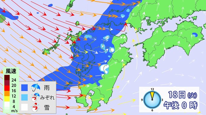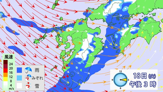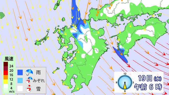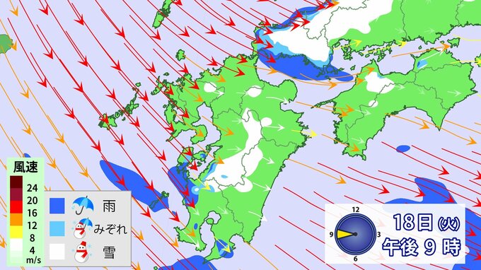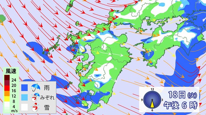 九州北部地方では、18日夕方から19日昼前にかけて山地を中心に大雪となるおそれ、、落雷や竜巻などの激しい突風、降ひょうのおそれがあります。