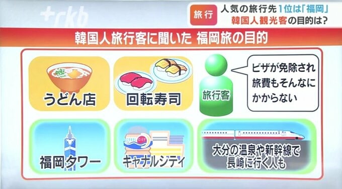 RKB池尻和佳子アナ:韓国人の旅行客に、福岡の旅の目的を聞きました。やはり食事を楽しみにしている方が非常に多いようです。ご紹介したうどん店のほかに「回転寿司を食べた」という人もいました。旅行客は「ビザも免除され、旅費もそんなにかからない」と話していました。