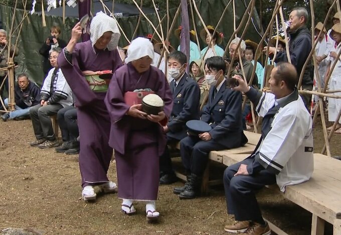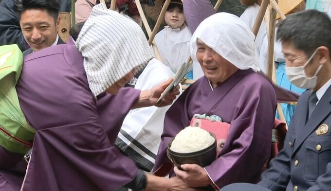 そして、収穫を意味するのは「孕(はら)み女」。女装した男性が大きなおなかを抱えて、大盛りのご飯を抱えて歩いていきます。