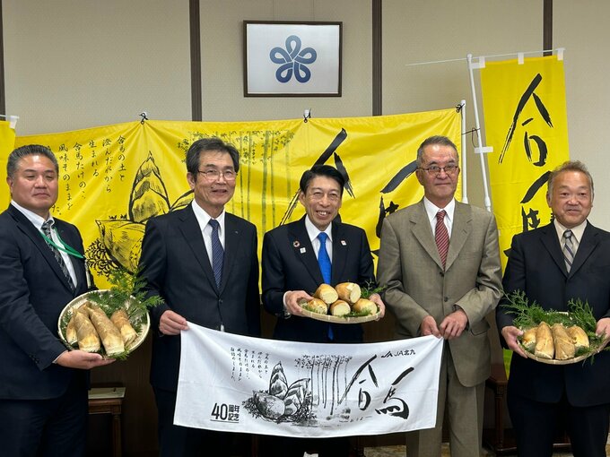 北九州市の合馬地区のブランドタケノコ「合馬タケノコ」について、生産者らが2日、福岡県庁を訪れ服部知事にタケノコを贈呈しました。