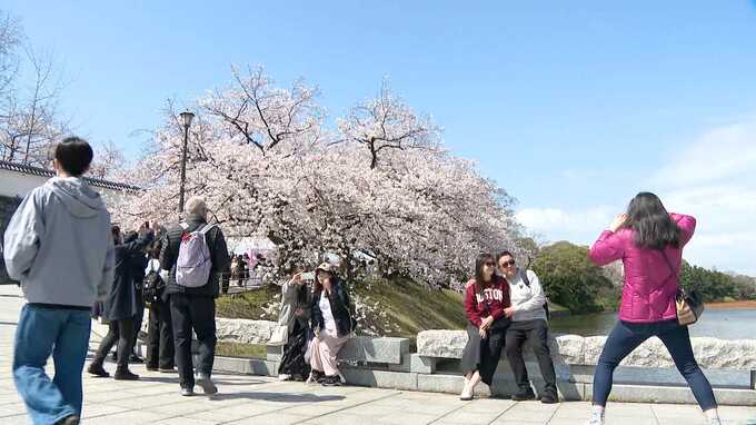 福岡を訪れた外国人観光客も桜を楽しんでいます。