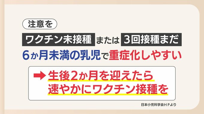 そして、このワクチン接種についてワクチンを打っていない、もしくは3回接種がまだの6カ月未満の乳児が百日せきに感染すると「重症化しやすい」ということです。