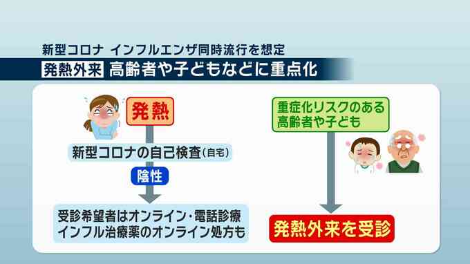 新型コロナとインフルエンザの同時流行に備えた政府の対策方針です。医療のひっ迫を防ぐため発熱などの症状が出た人にはまずは自宅でコロナの自主検査を受けてもらい、陰性だった場合、希望者はオンラインや電話での受診を推奨しています。また、インフルエンザの治療薬をオンラインで処方するということです。ただし、重症化リスクのある高齢者や子供などについては発熱外来への受診を呼びかけています。