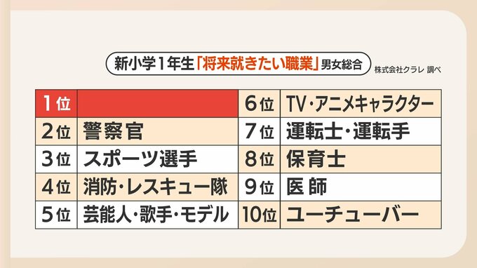 今年、新1年生になる4000人に聞いた将来就きたい職業の男女合わせたランキング警察官は2位、女の子がなりたいと話していたユーチューバーは10位となっています。