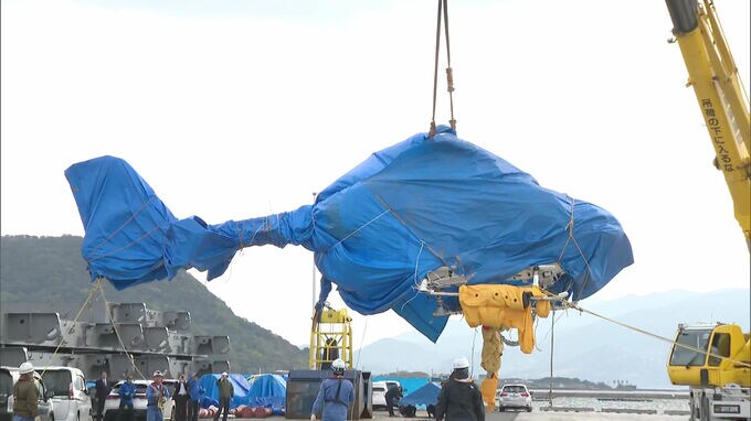 10日午前、佐賀県の唐津港で回収した機体が陸揚げされ、海上保安庁と運輸安全委員会が機体の損傷を調べました。