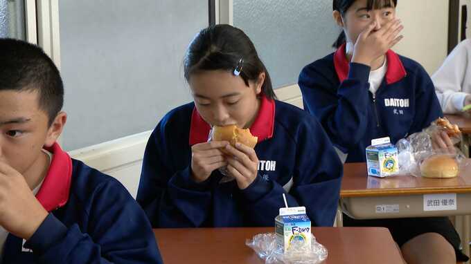 大野城市の大野東中学校です。給食の時間ですが、よく見るとお弁当の生徒もいれば、パンを食べている生徒もいます。実は、大野城市では2005年から中学校の給食に「選択制度」を導入しているんです。