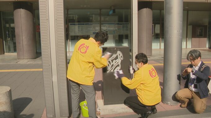 また、清掃会社に勤務する参加者は落書きを専用の薬剤で消したり、街灯に貼られたステッカーをヘラではがしたりしていました。