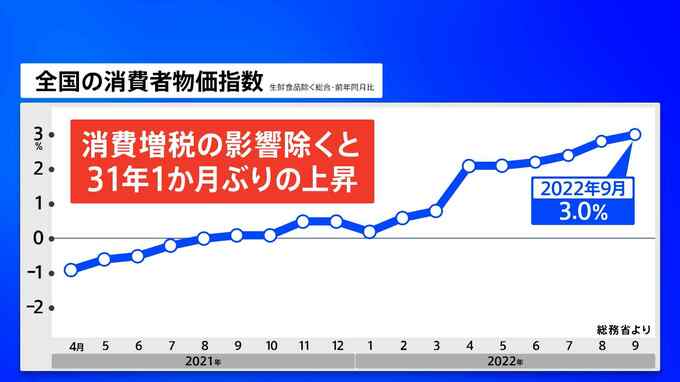 止まらない円安と物価高。9月の全国消費者物価指数は、去年より3.0%上昇していて、消費税増税の影響を除くと、3パーセント台になるのは約31年ぶりと歴史的な上昇幅を記録しています。