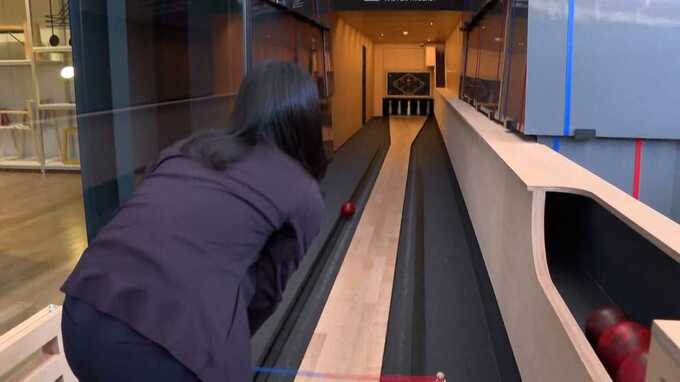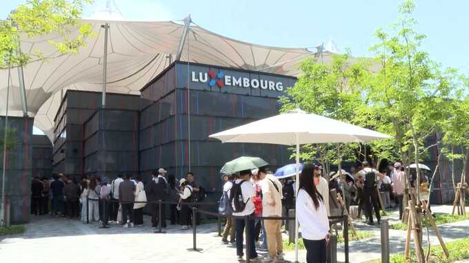 「ルクセンブルクのパビリオンにはカフェが併設されています。皆さんお酒や軽食を楽しんでいます。ルクセンブルクのパブには実はボーリングが設置されている文化があるということなんです。ボールは日本と違って穴がないです。なげて・・・難しいですね、レーンが狭くて長いでピンにあてるだけでも技術がいりそうです」