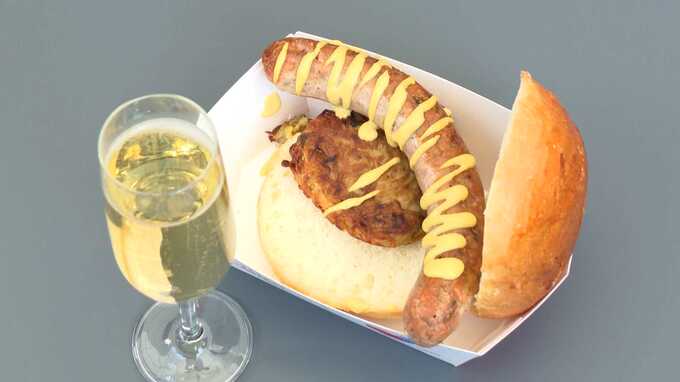 カフェでは、マスタードのかかったソーセージとポテトフリッターをはさんだサンドを食べることができます。