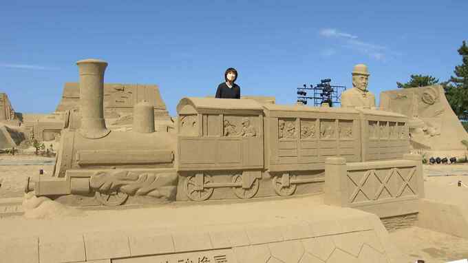 RKB堤千春「日本で鉄道が開業してから今年で150年です。こちらが最初の蒸気機関車です。今回の砂像展のテーマは『乗り物』となっています」