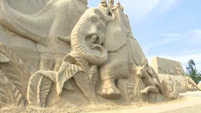 28日に開幕した「あしや砂像展」。国内外のプロの彫刻家や地元の中高生などが制作した25の作品が展示されています。