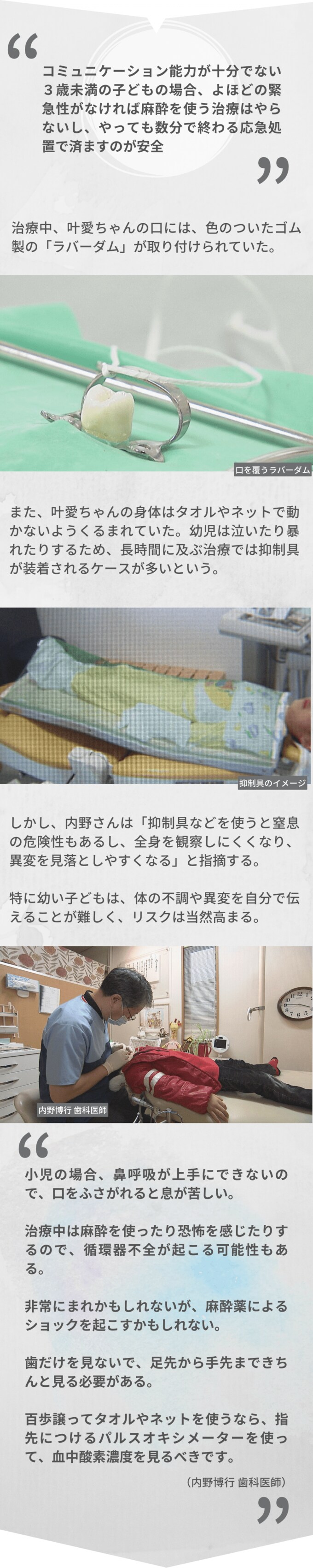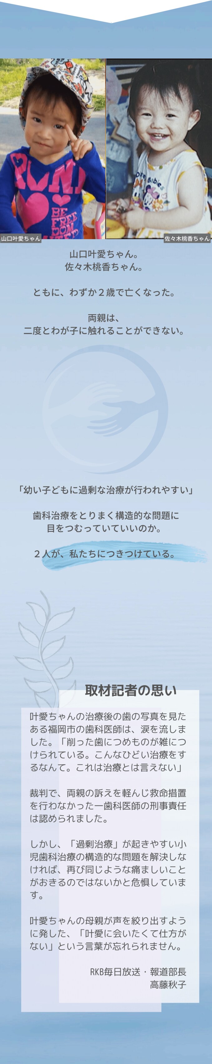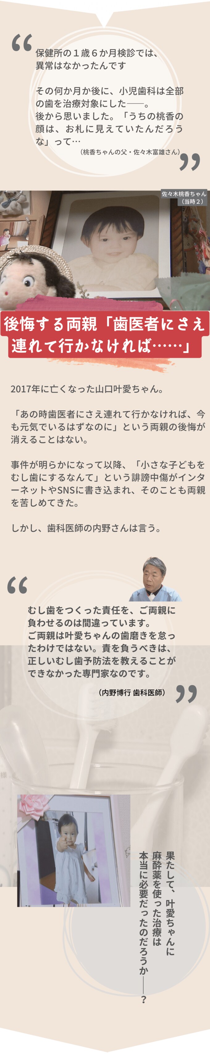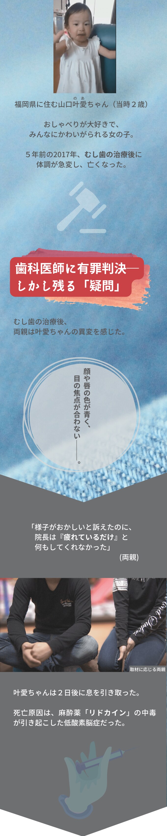 [特集] 歯医者に行っただけなのに-失われた2歳女児の命 2022年4月12日(火) 13:20 国内 幼い子どもを、歯医者に連れて行きました。ところが、そのまま愛する子の命が失われてしまったら――。「歯を治しに行っただけなのに……」想像もしなかった事態に苦しんでいる親たちがいます。 長期の取材を進めていく中で、このままでは同じような事故が繰り返される恐れがあると感じています。「誰でも被害者になりうる」のです。 子どもたちの命を守るために問いかけます。