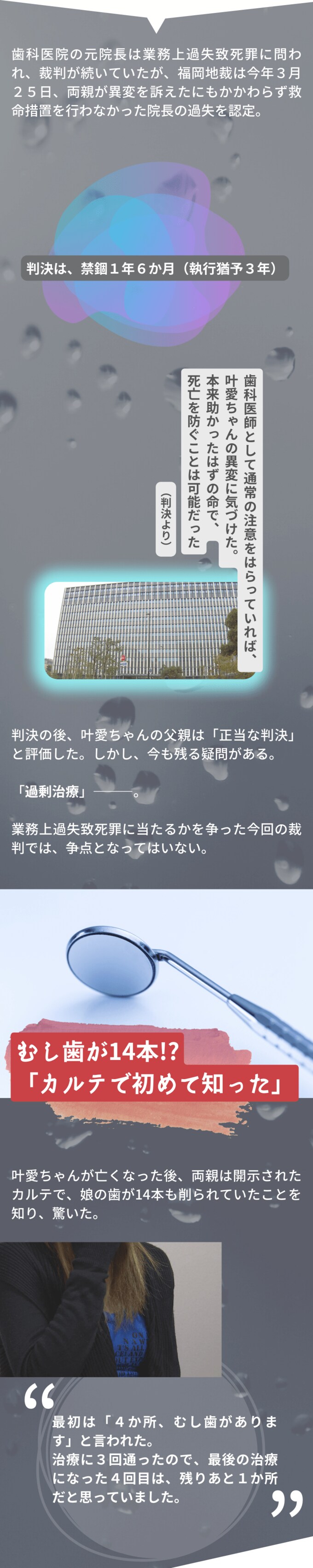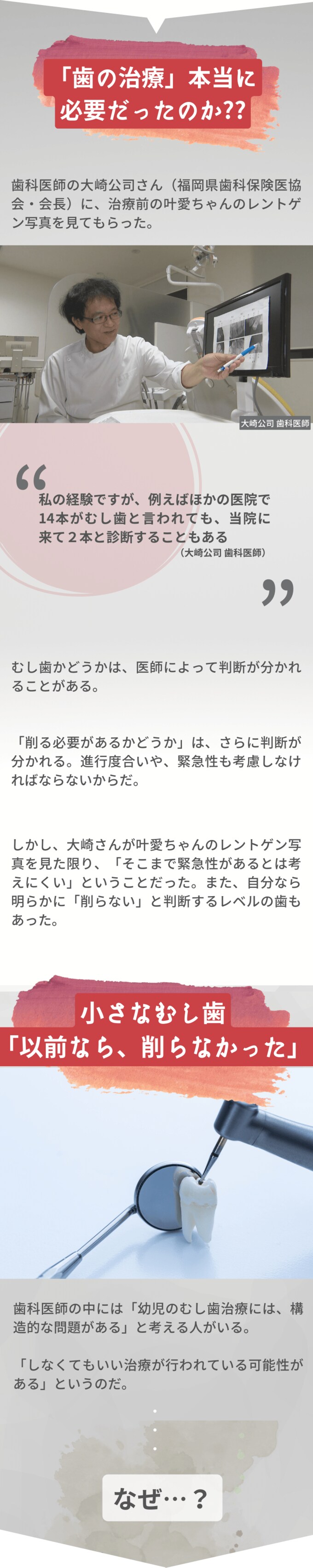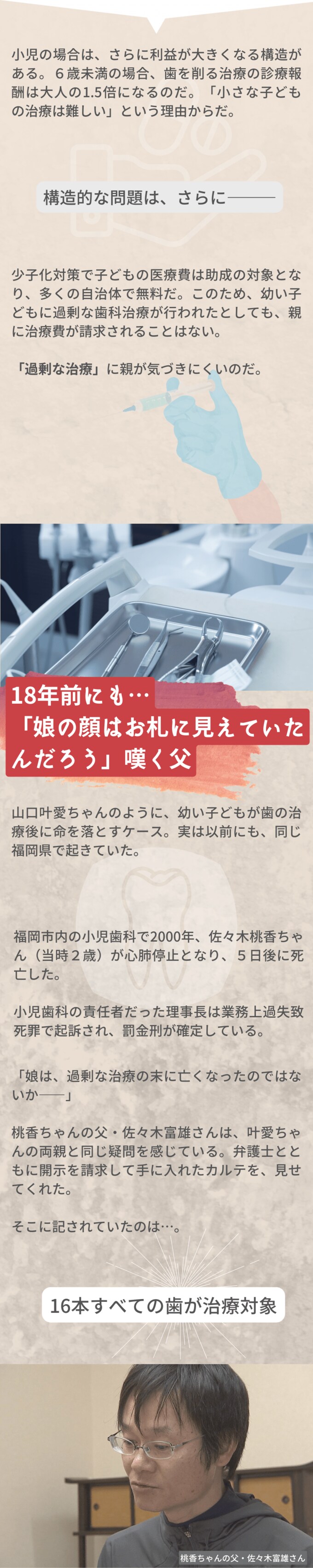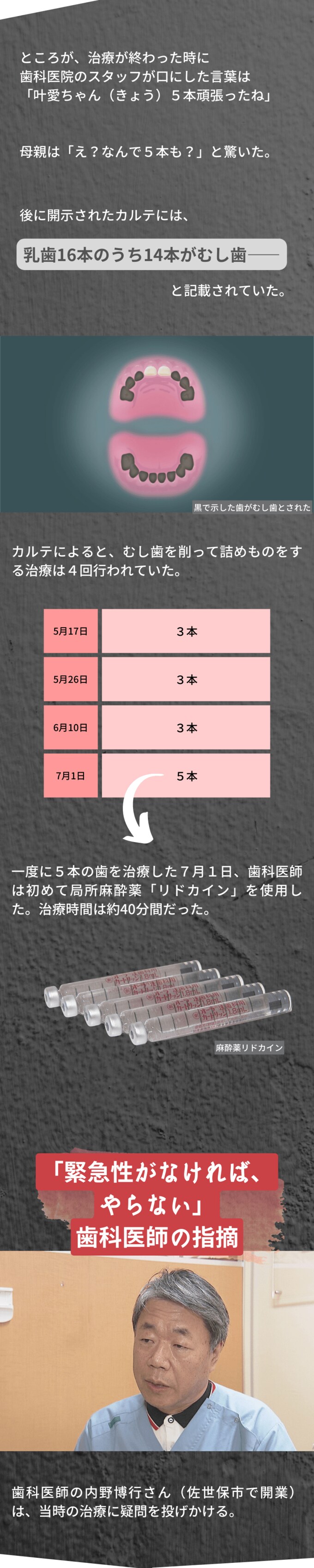 [特集] 歯医者に行っただけなのに-失われた2歳女児の命 2022年4月12日(火) 13:20 国内 幼い子どもを、歯医者に連れて行きました。ところが、そのまま愛する子の命が失われてしまったら――。「歯を治しに行っただけなのに……」想像もしなかった事態に苦しんでいる親たちがいます。 長期の取材を進めていく中で、このままでは同じような事故が繰り返される恐れがあると感じています。「誰でも被害者になりうる」のです。 子どもたちの命を守るために問いかけます。