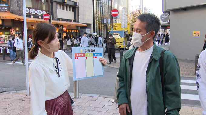 本田キャスター:「コロナ禍で3回目の忘新年会シーズン、街の50人に聞くと忘新年会をやる予定という人が21人、やらない予定という人が20人という結果でした。今年は忘年会をする人が増えてきているようです。」