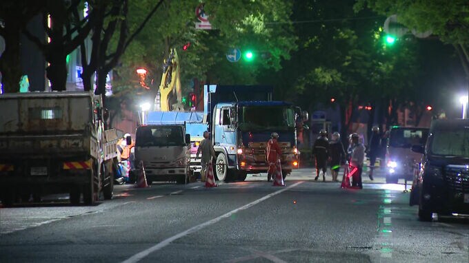 福岡市中央区今泉の国道202号・通称「国体道路」では、陥没した穴を埋め戻す作業が夜通し行われました。