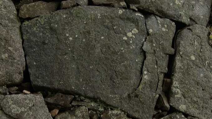 「空襲で被災した福岡城の石垣、石垣の表面が熱ではじけた跡です。福岡連隊の兵舎が焼けた熱で、猛烈な熱で」