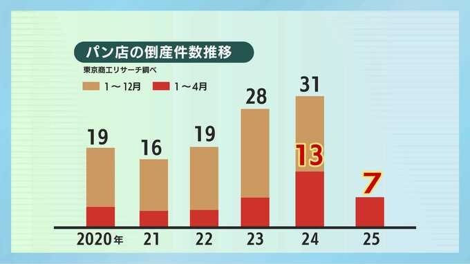 民間の調査会社、東京商工リサーチによりますと、小麦価格や電気・ガス代などの高騰でパン店の倒産件数はここ3年増加していました。