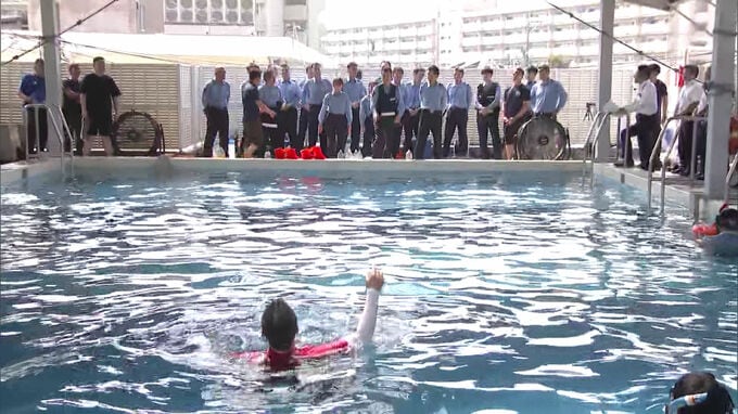 2日午後、福岡市東区の福岡県警第一機動隊の訓練用プールで行われた水難救助訓練には、福岡地区や筑後地区の地域課の警察官などおよそ60人が参加しました。