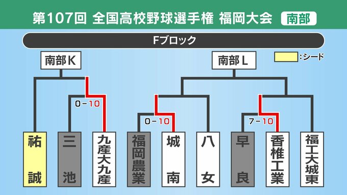 【めざせ甲子園!】夏の高校野球・福岡大会(南部)8日の結果 南筑・福岡講倫館・筑紫台・九産大九産が3回戦進出 久留米学園-筑前と福岡-香住丘は降雨のため継続試合に 2025年7月8日(火) 18:58 国内 【南部Fブロック】コールド勝ちの九産大九産が3回戦進出 九産大九産10-0三池
